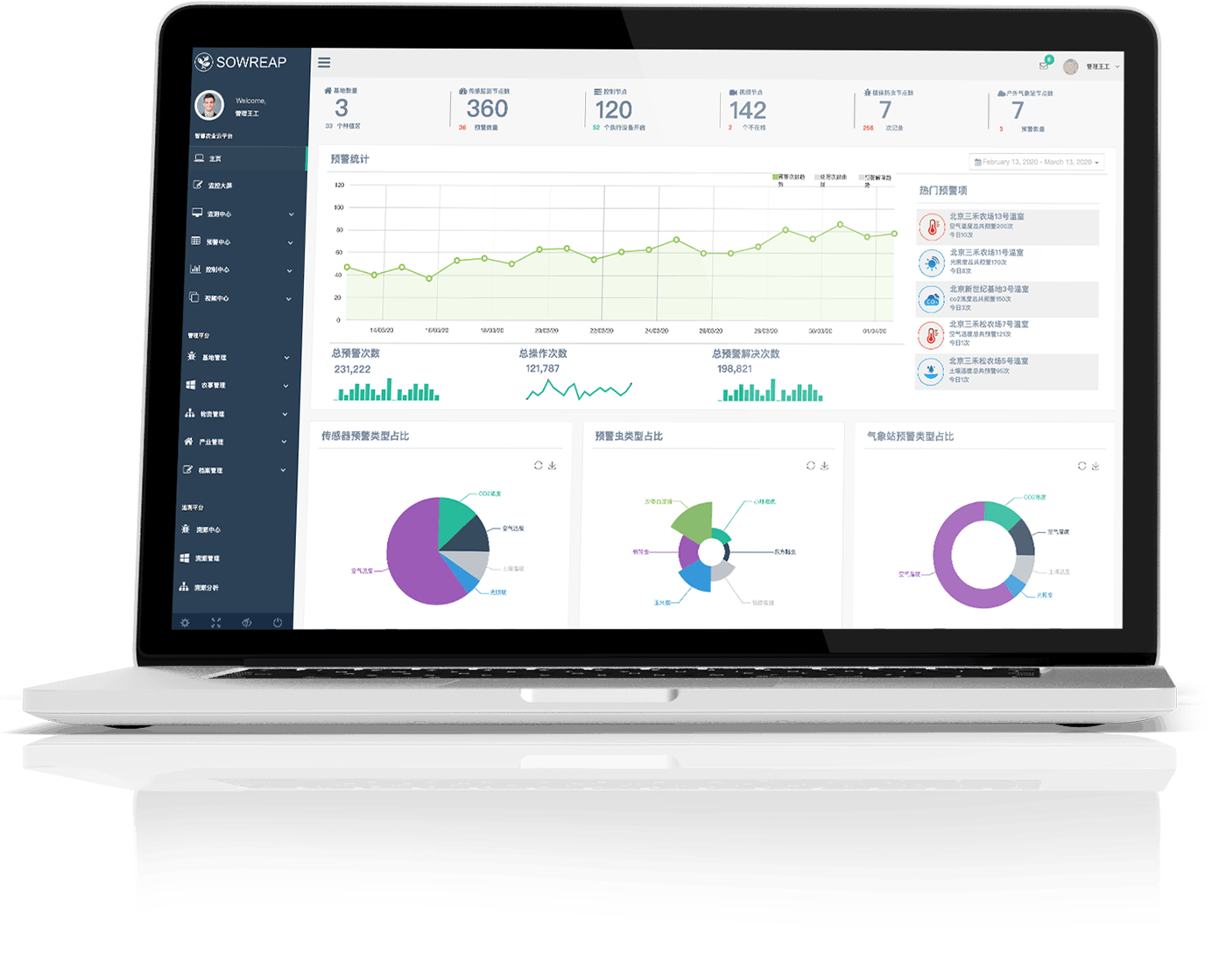利用新一代物联网、人工智能、区块链、卫星遥感、航空遥感等手段,动态监测大田种植和设施园艺作物的种植类型、种植面积、土壤墒情、作物长势、灾情虫情,及时发布预警信息,提升农场生产管理信息化水平